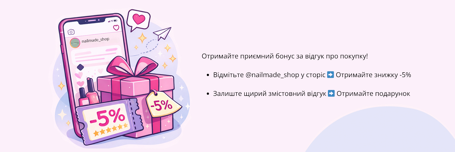 Відмічайте сторінку магазину @nailmade_shop у Instagram Stories та отримуйте унікальний промокод на знижку -5% на наступне замовлення*. Строк дії промокоду - 3 місяці.