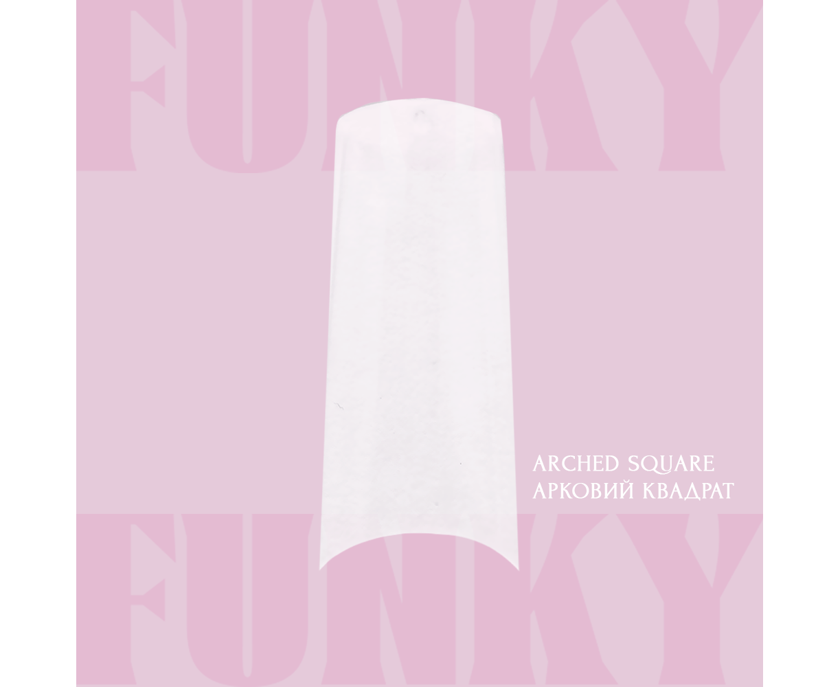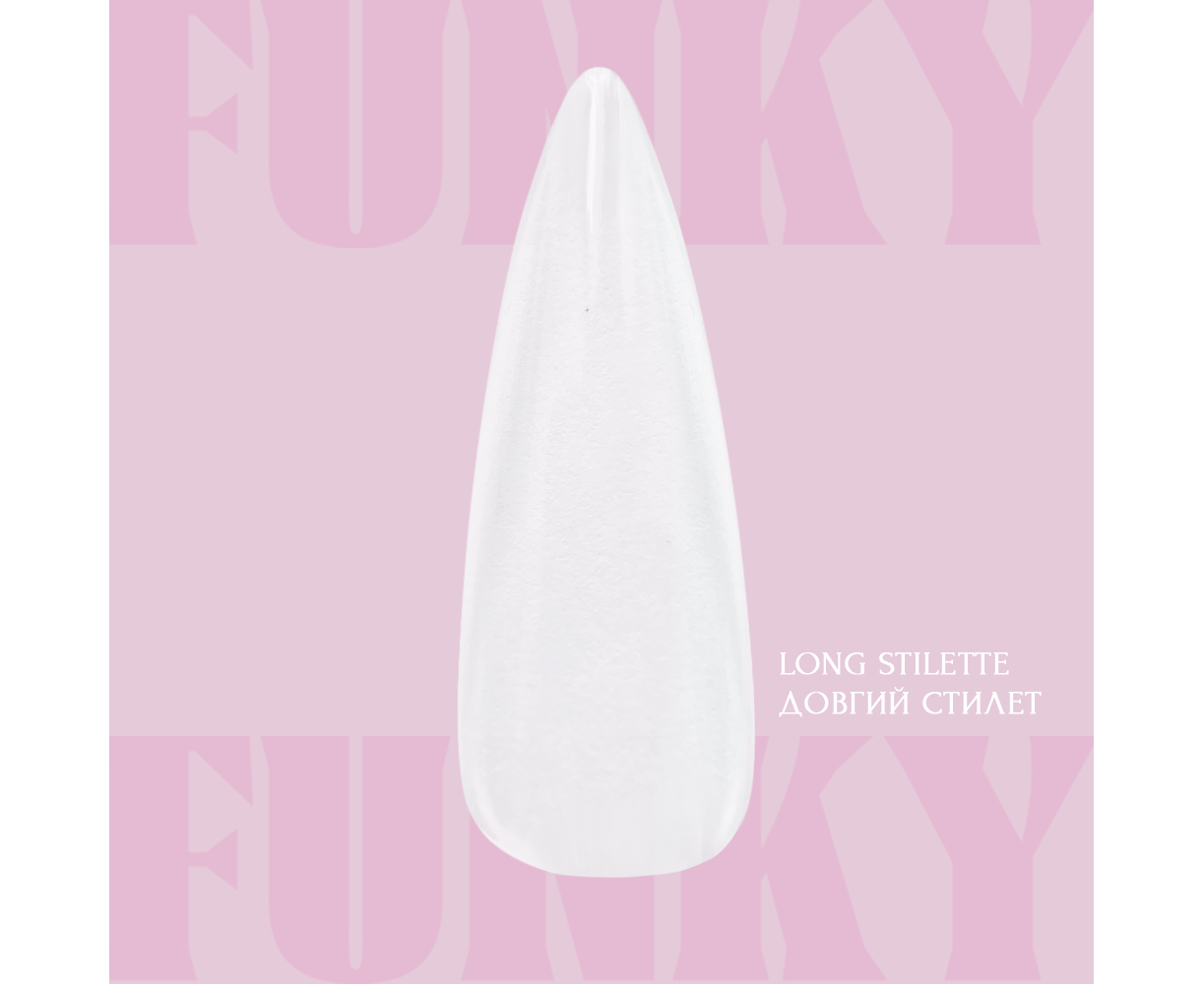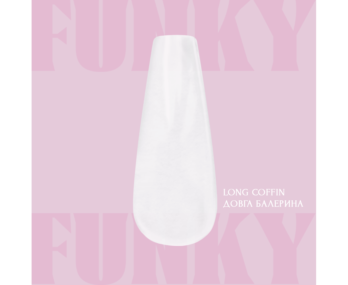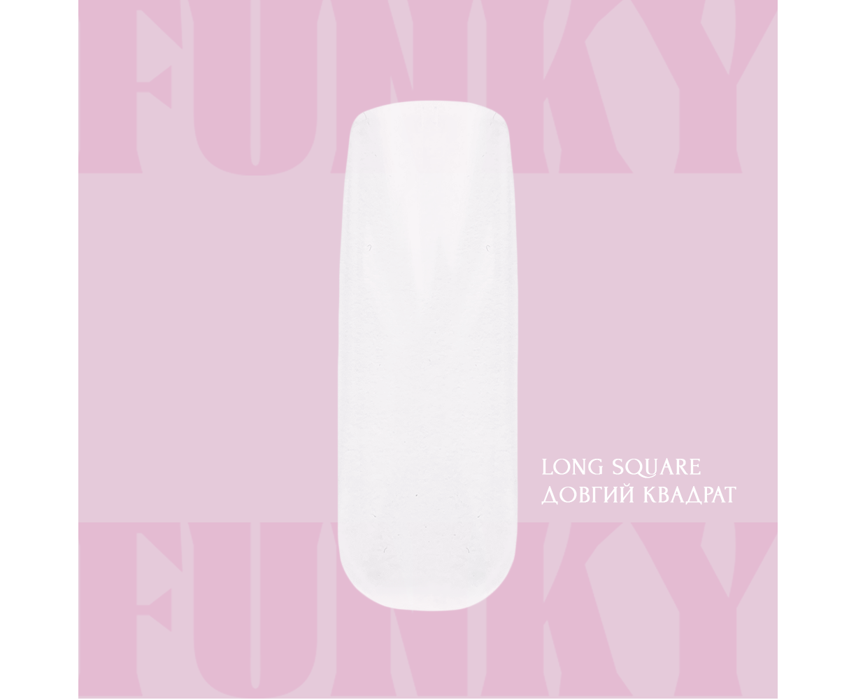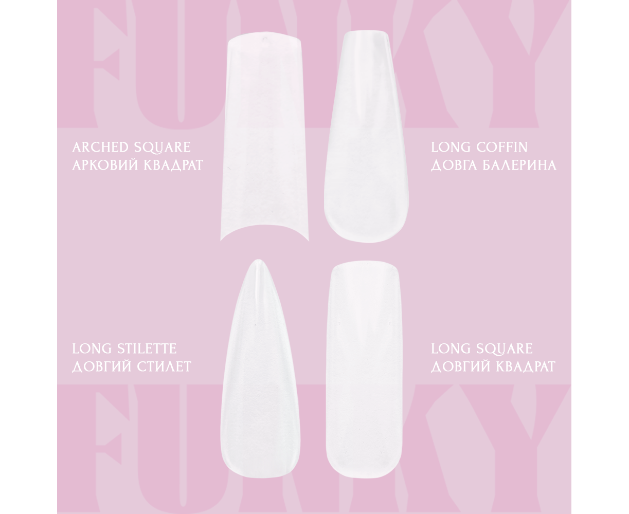 FUNKY GEL TIPS - MIX містять по 3 пластини форм STILETTE long, COFFIN long, SQUARE long та 1 пластину форми ARCHED SQUARE extra long із С-подібним вирізом від 0 до 11 розміру в коробці, що дозволяє обрати найкращу форму та розмір для кожного нігтя.