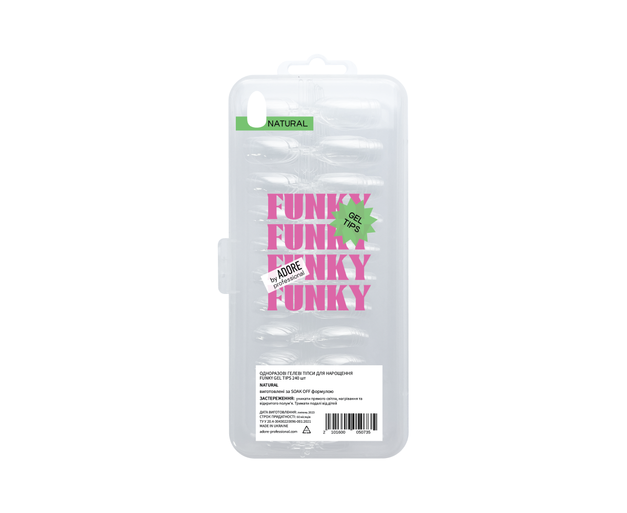 FUNKY GEL TIPS 一 тонкі, але міцні та гнучкі тіпси на основі моделюючого гелю та пластику. Добре витримують повсякденні навантаження, гарно амортизують та зовнішньо майже не відрізняються від натуральних нігтів. Вироблені за SOAK OFF формулою, підходять для знімання як розмочуванням за допомогою GEL REMOVER, так і фрезою. Тіпси легко опилювати та змінювати довжину.