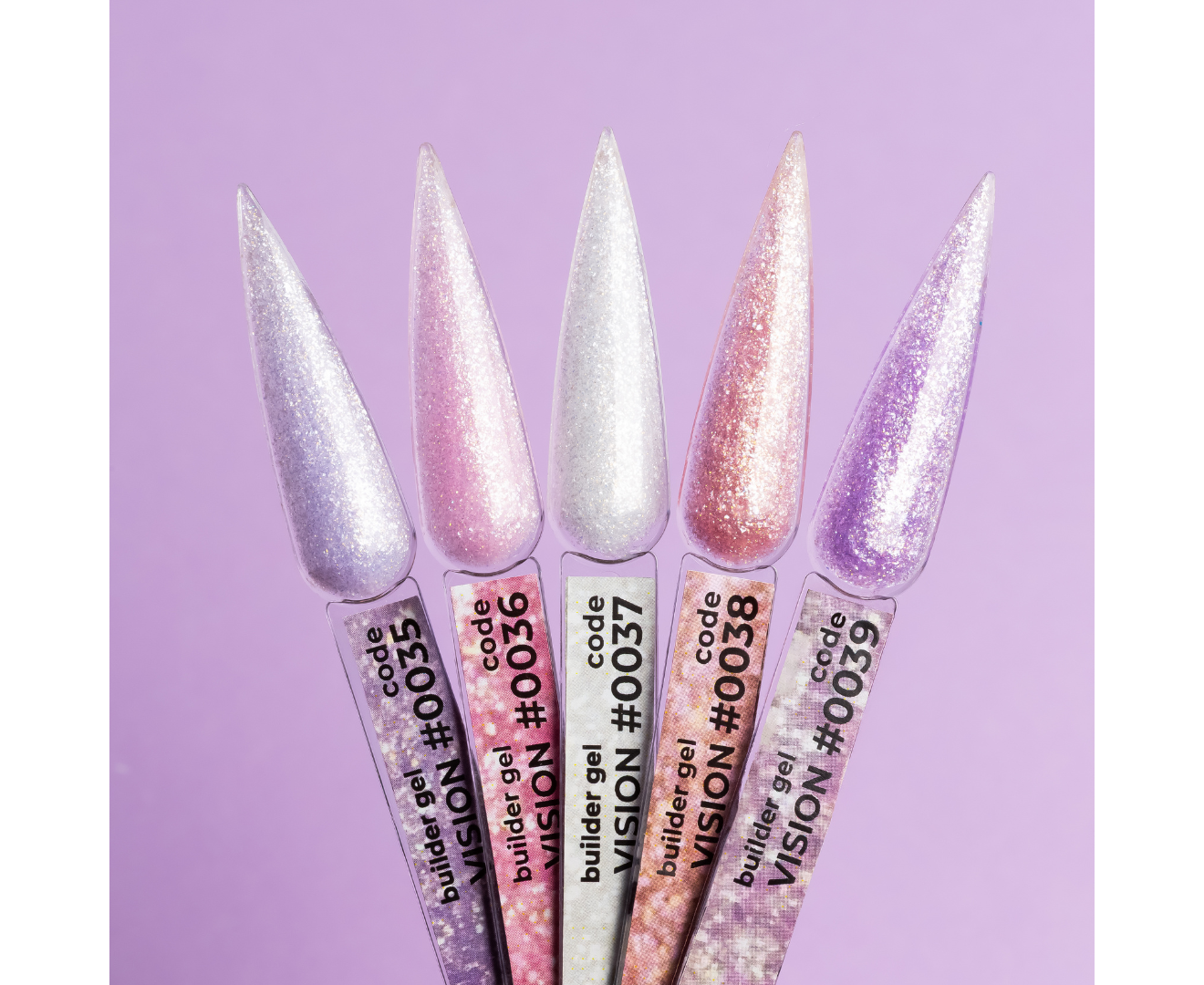 Колекція Builder Gel Vision #0035 - 0039 - це неймовірне сяйво блискіток в поєднанні з улюбленою універсальністю та міцністю Builder Gel.