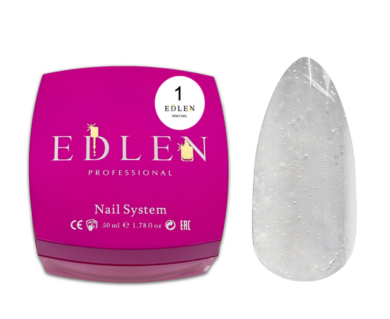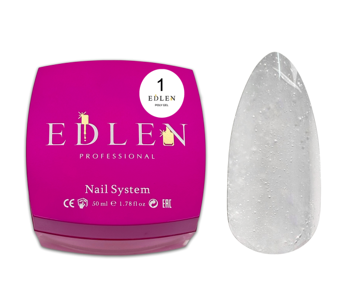 Poly gel від EDLEN — багатофункційний твердий пастоподібний гель преміум якості, що застосовується для виправлення деформацій і скрученості нігтьової пластини, для ремонту тріщин нігтя, нарощування, донарощування, укріплення, а також для корекції нарощених нігтів. Має дрібнозернисту структуру, а отже — високу твердість, тому буде триматись навіть на гострому квадраті чи екстримальній довжині.