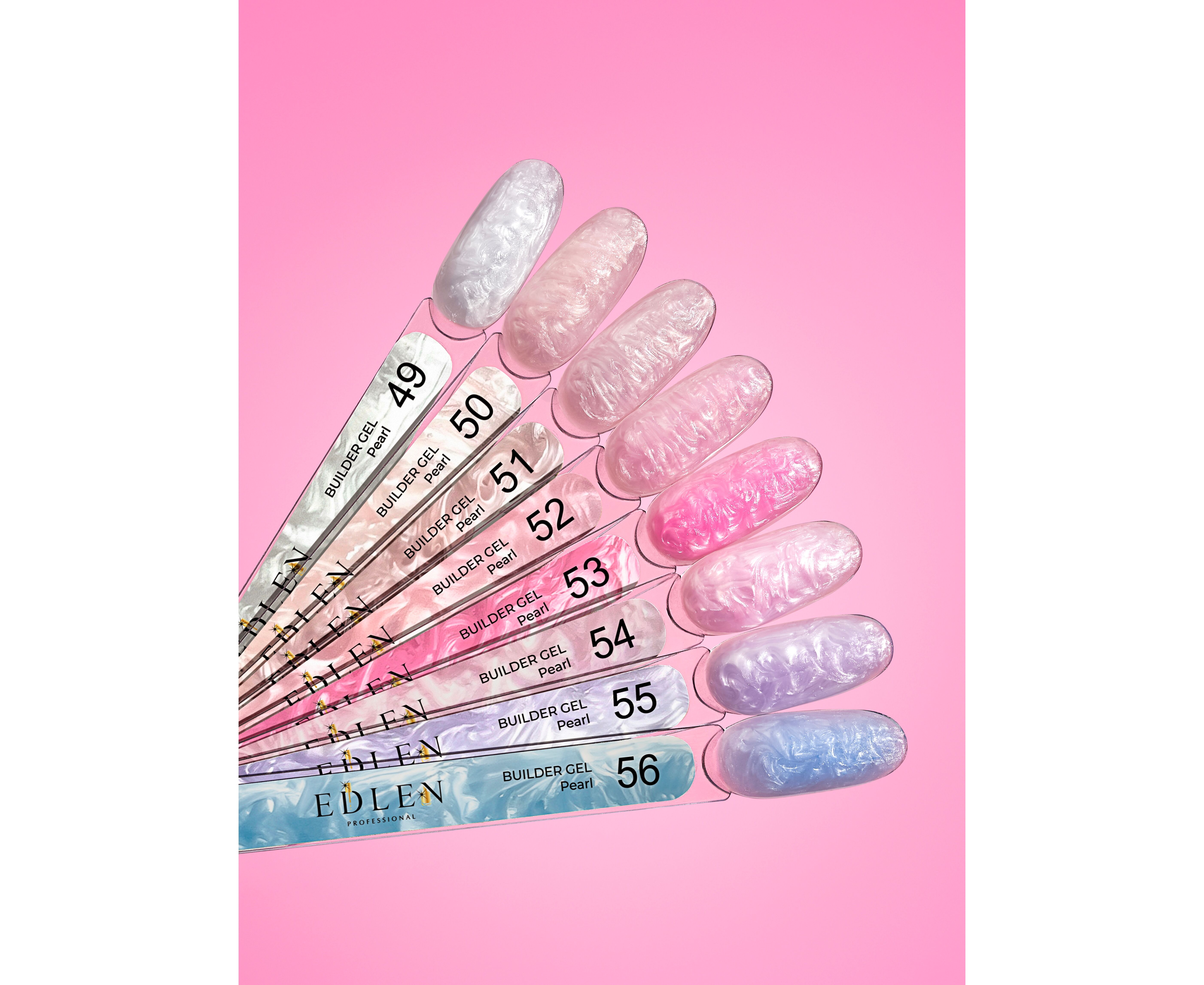 Не рекомендується використовувати, як перший шар у нарощуванні, оскільки через велику кількість шиммеру твердість трохи знижена. Для формування вільного краю краще використати Builder gel Edlen №01/Builder gel Edlen №02, а колекцію Builder gel Pearl уже в якості вирівнюючого шару.