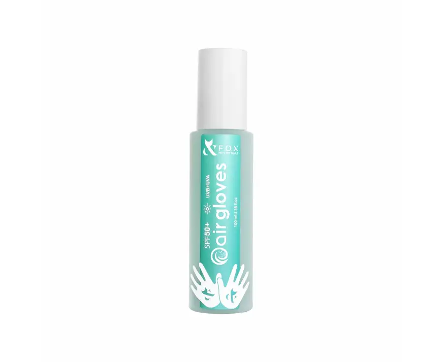 F.O.X Air Gloves — справжній прорив у сфері nail-індустрії. Продукт забезпечує надширокий спектр UVA+UVB, РА захисту від UV/LED випромінювання манікюрних ламп, синього світла смартфонів і комп’ютерів, а також від шкідливого сонячного впливу. Він інтенсивно зволожує шкіру, залишає її еластичною та тонізує, надаючи їй здоровий вигляд. Засіб відновлює гідроліпідний баланс шкіри, допомагаючи запобігти негативним наслідкам від лампи для манікюру.