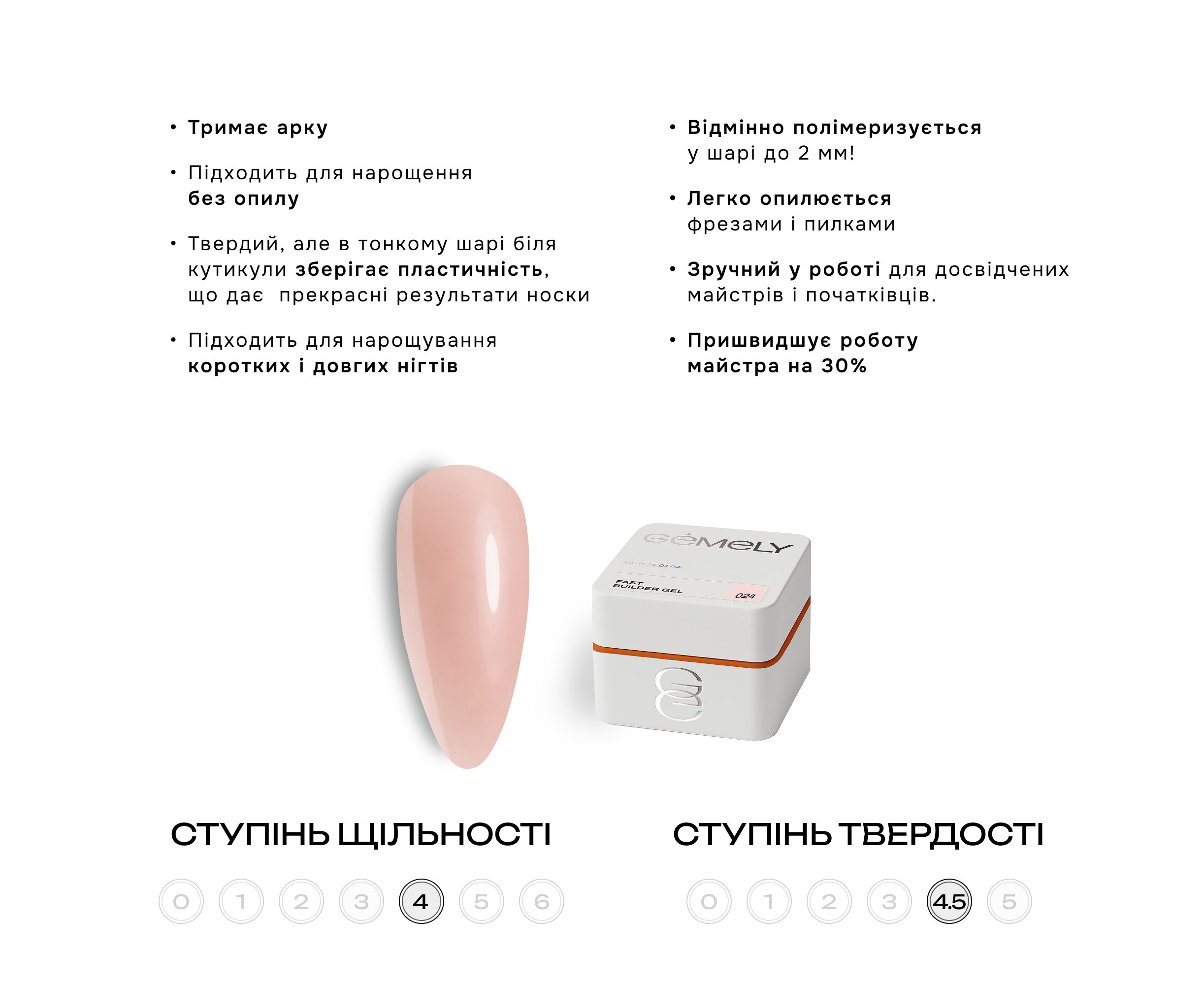 Не дає усадки, тому нарощені нігті зберігають чітку форму та стійкість до механічних навантажень до 4 тижнів, незалежно від довжини.