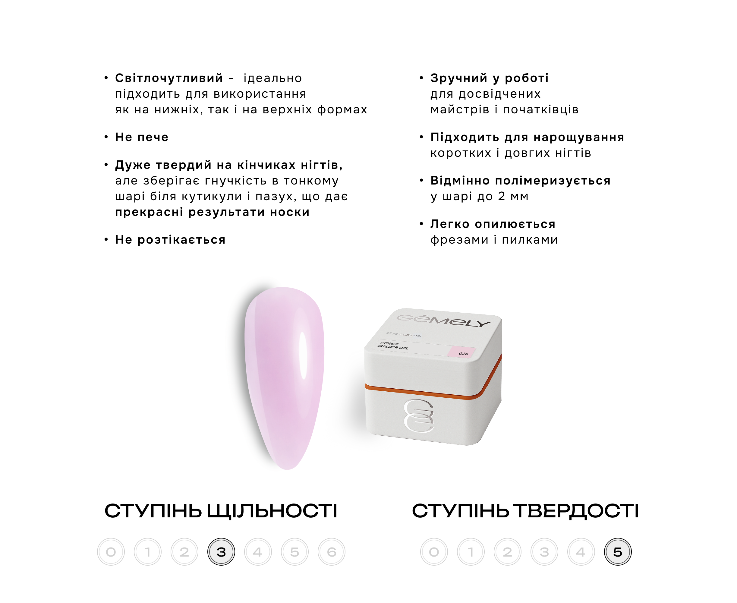 Power builder gel – Твердий гель середньої консистенції. Світлочутливий, дуже зручна кремова консистенція. Підходить для верхніх форм, укріплення.