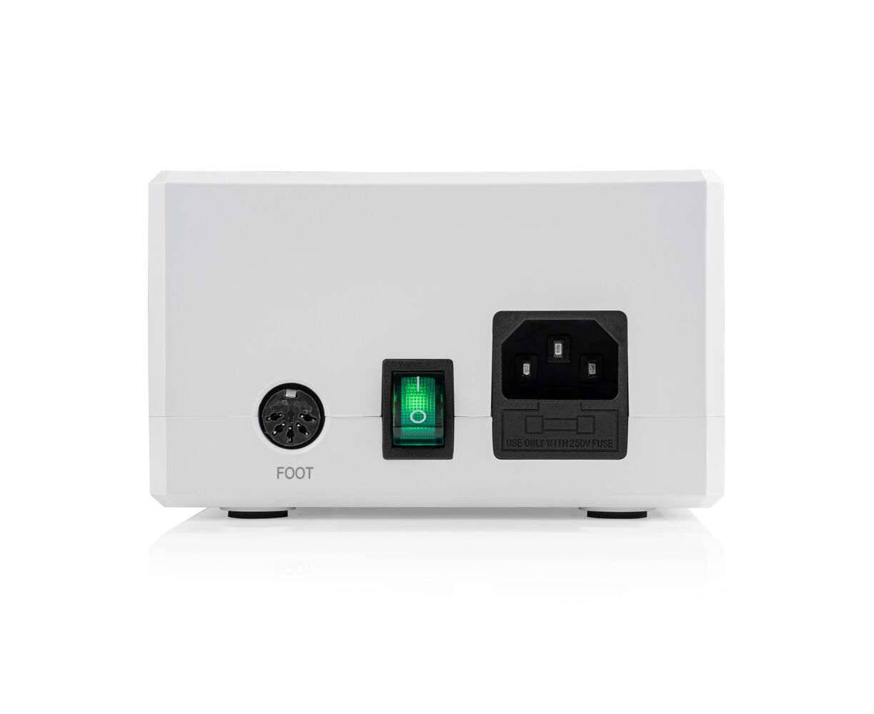 - Професійна «розумна» педаль, яка дозволяє силою натиску регулювати швидкість обертання фрези — як педаль газу в авто. Ідеально підійде для педикюру та подології, бо делікатна робота з чутливими зонами потребує чутливого керування.