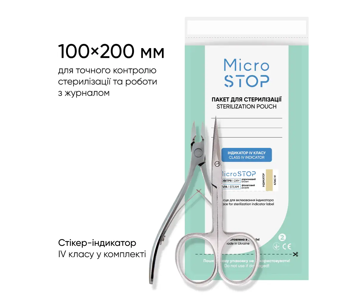 MICROSTOP. Крафт-пакети "PRO" 100х200 мм, 100 шт, сухожар, білі, з індикатором 4 класу