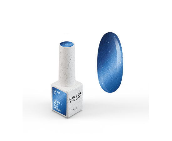 NAILSOFTHEDAY Gel polish Cat Eye 08 — синій гель-лак котяче око з дрібною поталлю із легким світловідбиваючим ефектом, що перекривається в один шар.