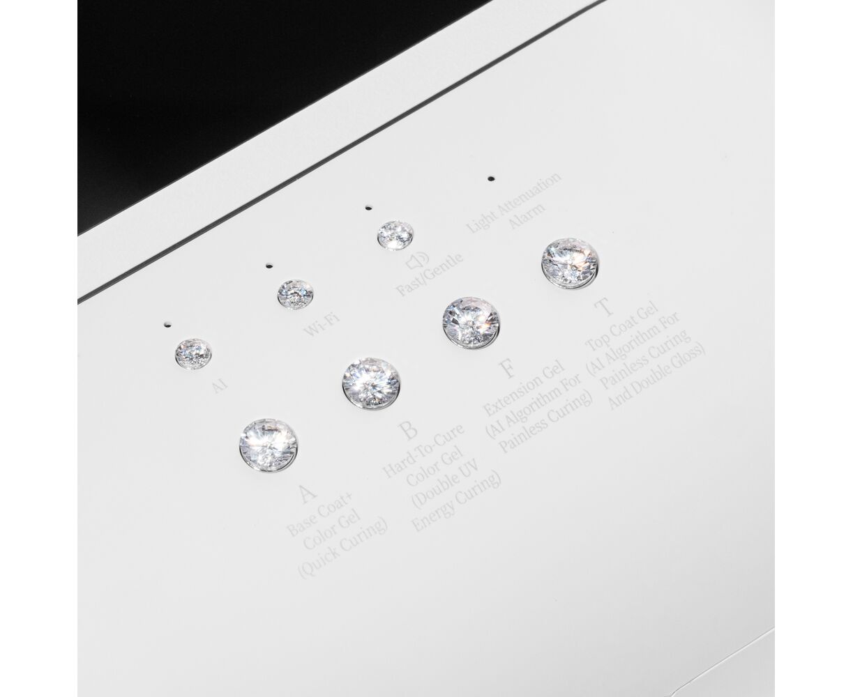 ШІ-лампа має інтелектуальні режими полімеризації, які активуються окремою кнопкою відповідно до типу покриття — база, топ, гель, кольоровий гель тощо. Усі параметри вже запрограмовані — майстру достатньо лише натиснути відповідну кнопку, і лампа працюватиме у потрібному режимі!