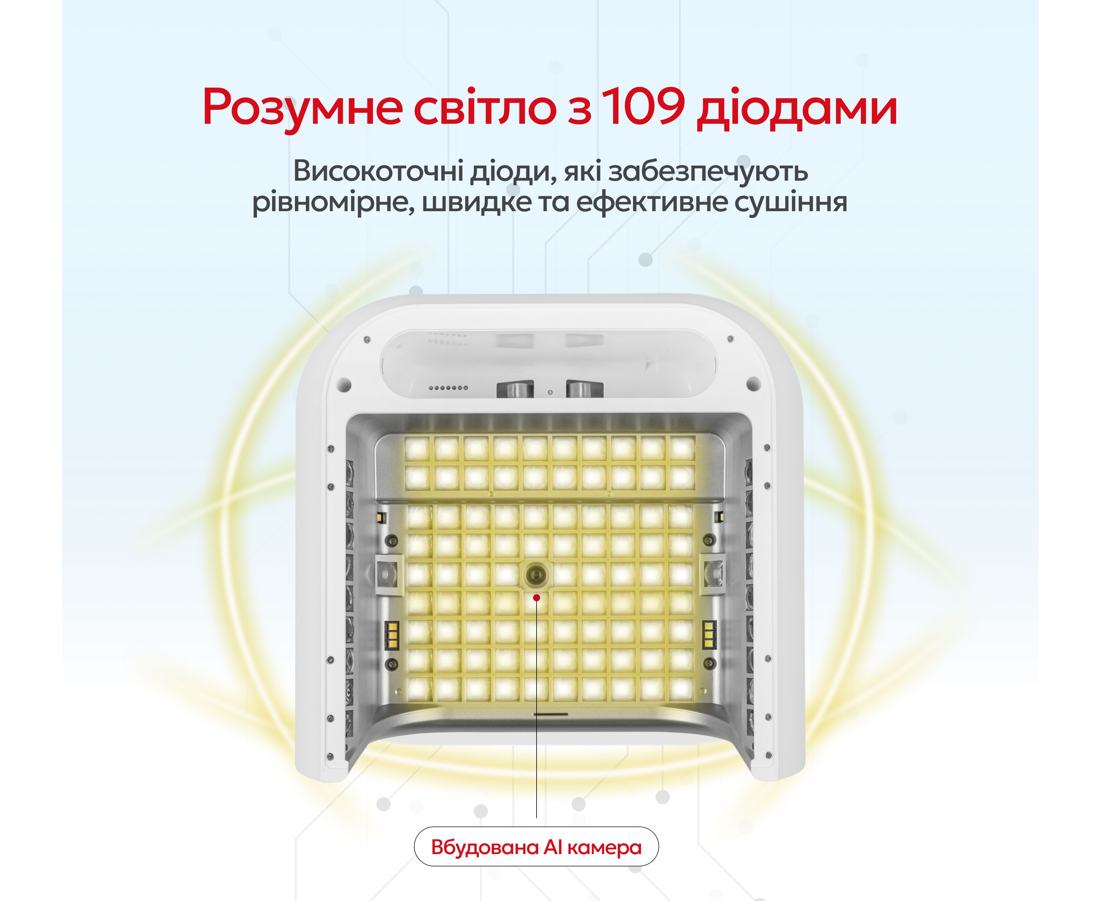 109 світлодіодів з оновленою архітектурою випромінюють світло без фіолетового спектра — безпечно для очей, шкіри та нігтів.