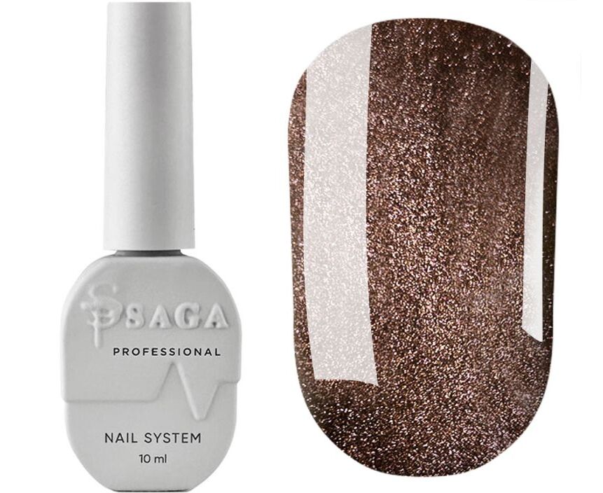 Saga Cat Shine — гель-лак із магнітним ефектом «котяче око», який створює на нігтях глибоке, космічне сяйво з кришталевими переливами. Металеві частинки у складі реагують на магніт, утворюючи унікальні світлові відблиски, що змінюються при русі руки — нігті сяють, немов дорогоцінне каміння.
