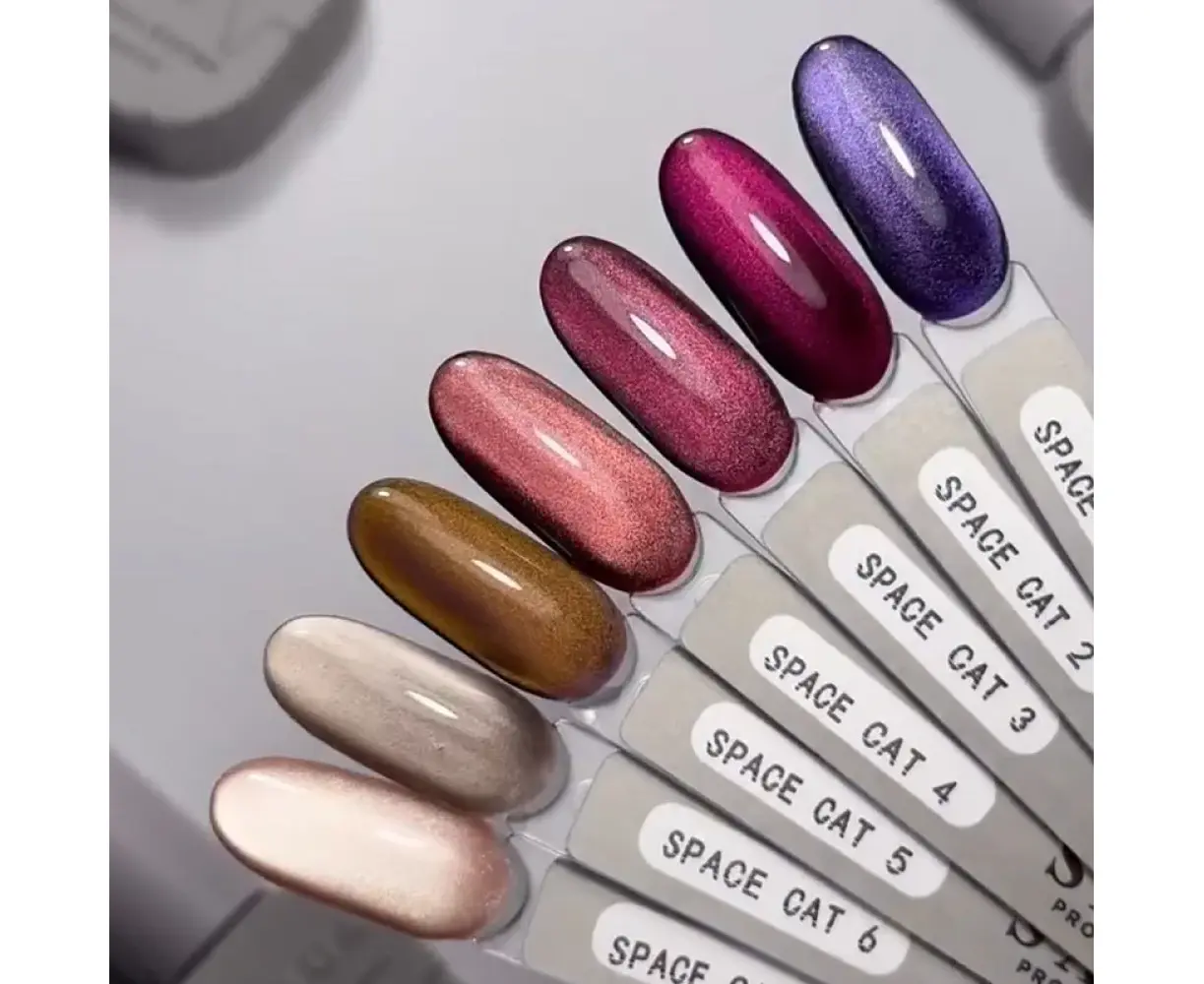 Saga Professional Space Cat - розкішна колекція щільних сяючих гель-лаків з ефектом «котячого ока» та приголомшливим космічним блиском. Відтінки вражають глибиною, красою й багатогранним сяйвом, а під дією магніту легко формується чарівний світловий відблиск, який можна створювати з різних боків для унікального дизайну. Манікюр із цими гель-лаками набуває по-справжньому фантастичного вигляду та має стильну «родзинку».