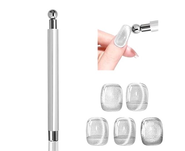 - Кулька притягує металеві частинки в лаку, створюючи ефект “котячого ока”, хвиль, світлових відблисків або об’ємних візерунків.