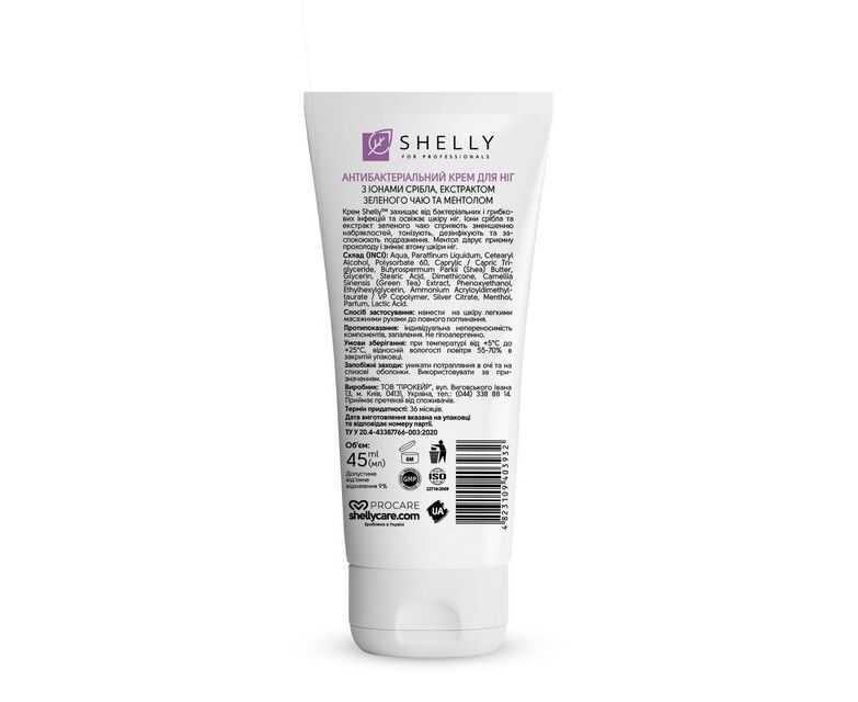 УЦІНКА /SHELLY. Antibacterial foot cream with silver ions, green tea extract and menthol, 45 ml. Антибактеріальний крем для ніг з іонами срібла, екстрактом зеленого чаю та ментолом