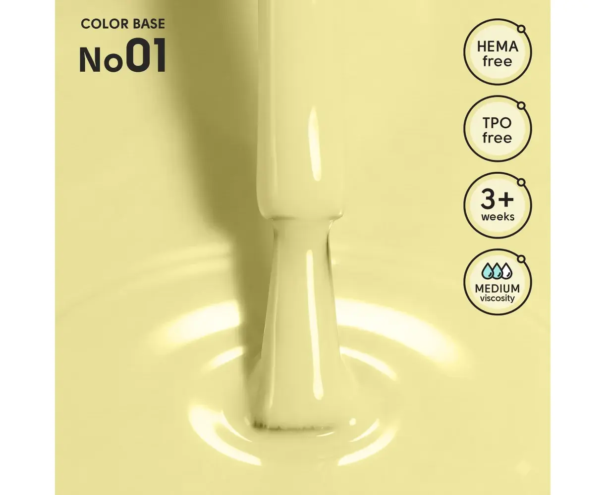 Кольорові бази насичених відтінків забезпечують надійне покриття та підходять для вирівнювання нігтьової пластини. Завдяки середній консистенції легко самовирівнюються, створюючи акуратну й гладку поверхню без зайвих зусиль. Можуть використовуватися як самостійне покриття або як основа під дизайн. Забезпечують стійкість манікюру понад 3 тижні, зберігаючи яскравість кольору та естетичний вигляд. Не містить HEMA та TPO.