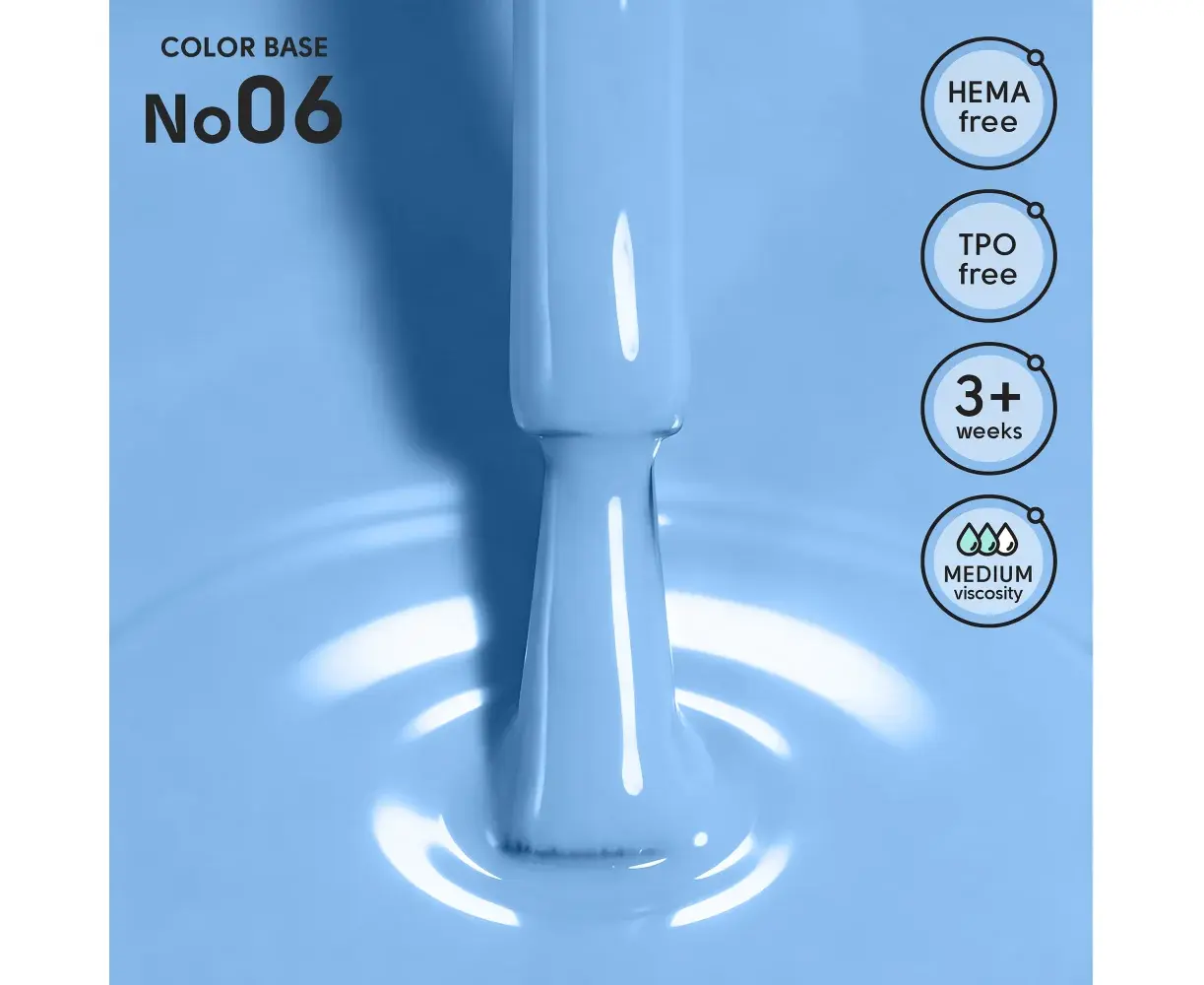 Кольорові бази насичених відтінків забезпечують надійне покриття та підходять для вирівнювання нігтьової пластини. Завдяки середній консистенції легко самовирівнюються, створюючи акуратну й гладку поверхню без зайвих зусиль. Можуть використовуватися як самостійне покриття або як основа під дизайн. Забезпечують стійкість манікюру понад 3 тижні, зберігаючи яскравість кольору та естетичний вигляд. Не містить HEMA та TPO.