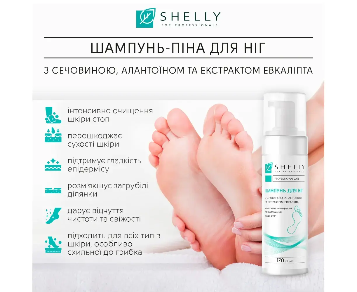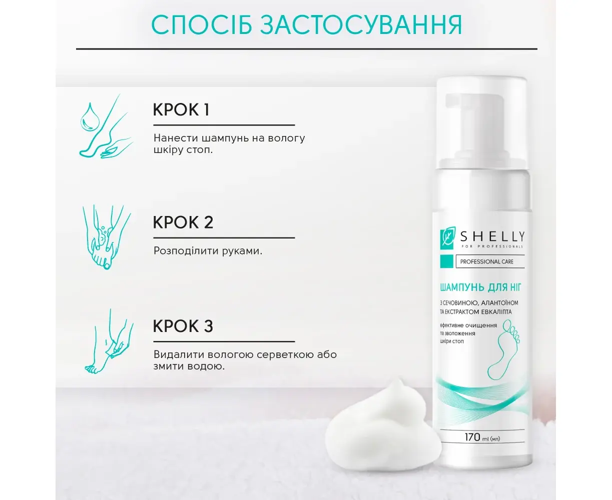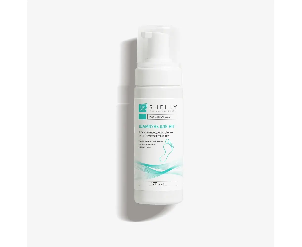 SHELLY. Foaming foot shampoo with urea, allantoin and eucalyptus extract, 170 ml. Шампунь-піна для ніг з сечовиною, алантоїном та екстрактом евкаліпта