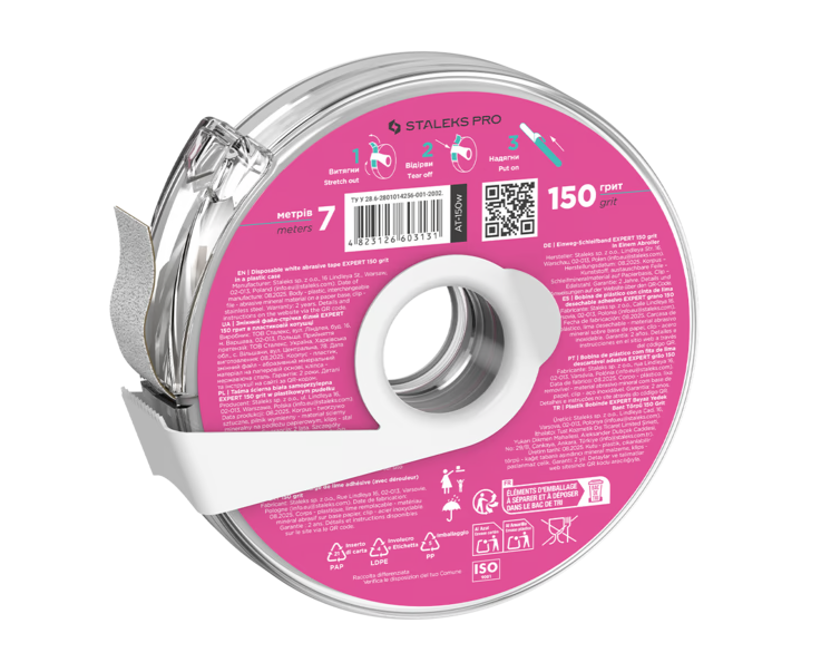 Змінний файл стрічка Staleks PRO EXPERT 150 грит у пластиковій котушці AT-150w — це професійний інструмент при проведенні манікюру й педикюру, призначений для акуратної корекції форми та шліфування нігтьової пластини. Її довжина 7 метрів, з абразивом середньої жорсткості (150 грит), комфортна в точному обпилюванні штучних покриттів і натуральних нігтів, не нагріває поверхню та рівномірно знімає матеріал. Надійна клейова основа гарантує міцну фіксацію на металевих або пластикових пилках-основах (MBE-20, MBE-20s, SPBE-20, SPBE-20s), а спеціальне покриття захищає абразив від забивання пилом.