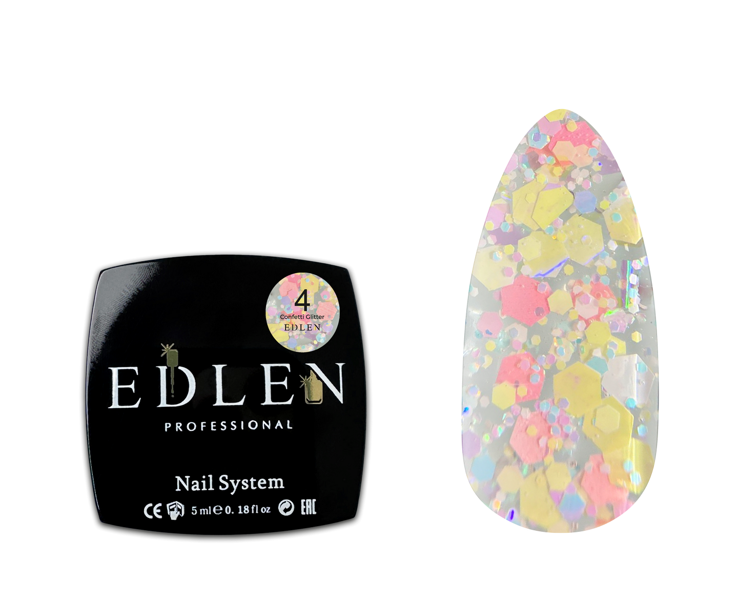 Confetti Glitter від EDLEN — колекція гліттерних гель-лаків, які чудово урізноманітнять будь-який манікюр. Створені з поєднать різних блискіток та їхніх форм, а при потраплянні світла дуже красиво переливаються. Ці гель-лаки чудово підійдуть для створення різних дизайнів та об'ємних елементів. Також, у колекції є нейтральні відтінки для поціновувачів нюдового покриття з легкою родзинкою.