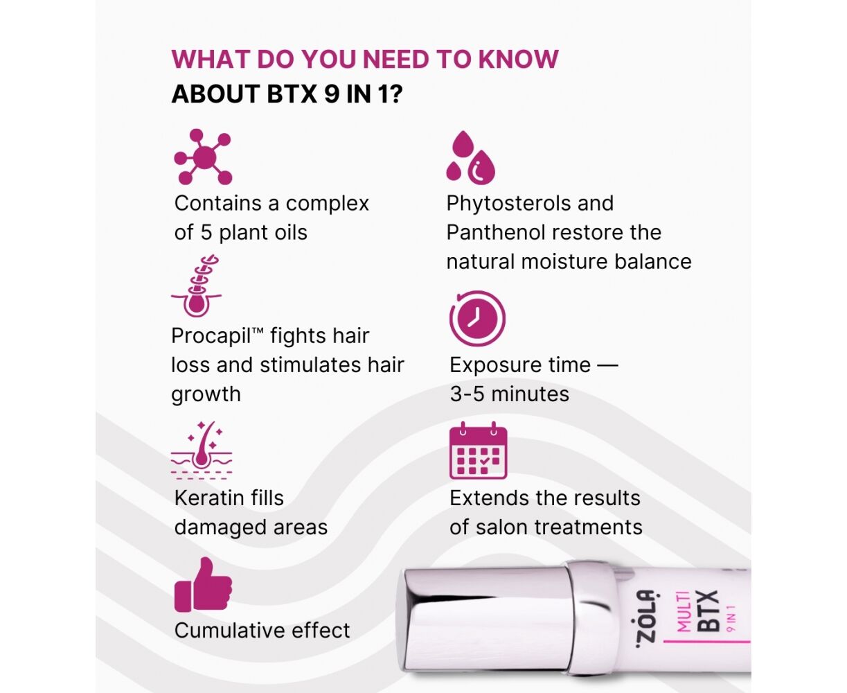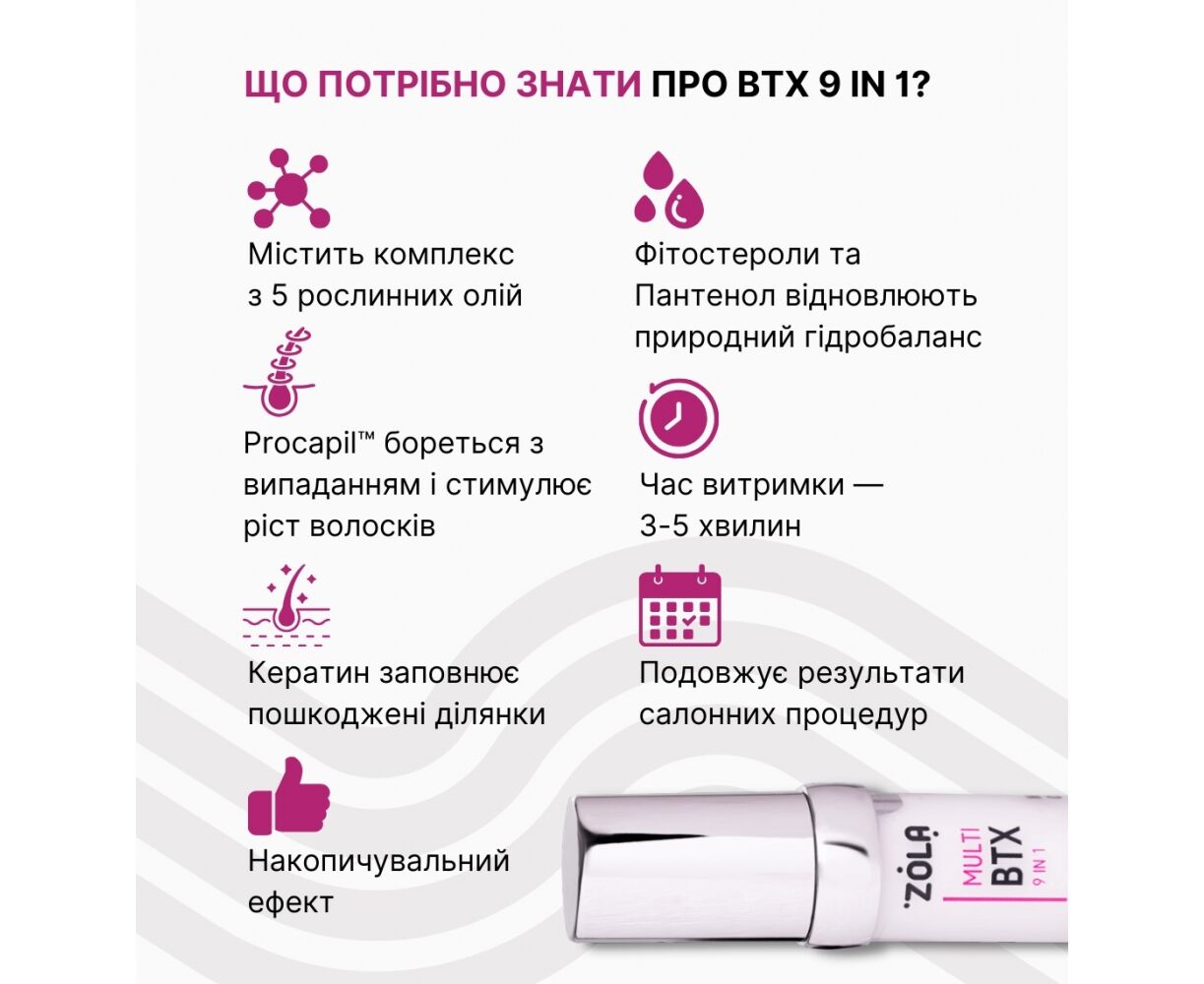 MULTI-TREATMENT BTX 9 в 1 виконує 9 ключових функцій, від антистресової терапії до захисту кольору та UV-захисту, реконструкції, боротьби з випадінням волосся, активації росту, збільшення об'єму, додавання м'якості, блиску, та дисциплінування волосин.
